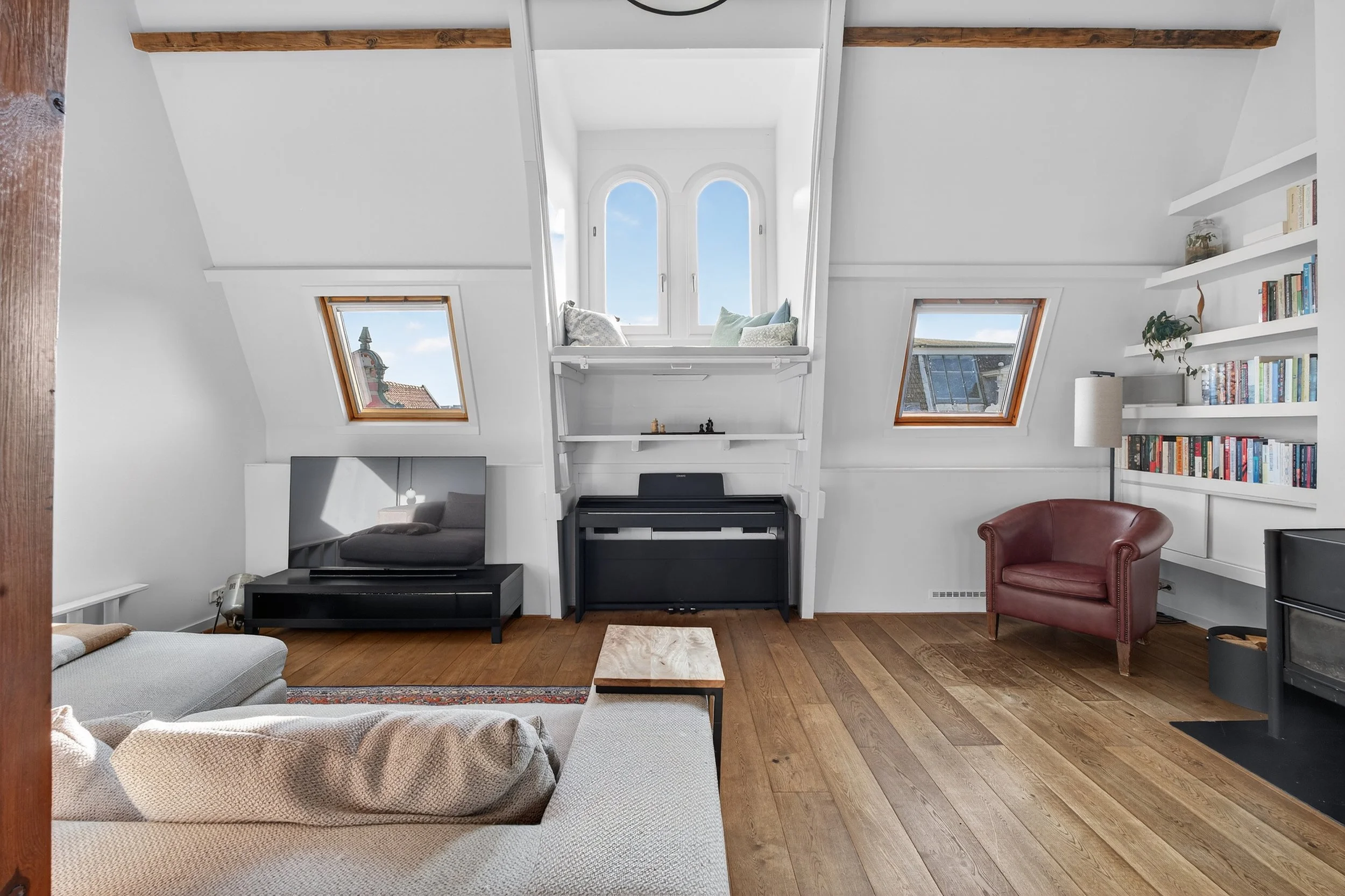 Via het gemeenschappelijke trappenhuis bereik je de entree op de derde verdieping, met garderobe en meterkast, waarna een karakteristieke trap leidt naar de lichte en ruime woonverdieping op de vierde verdieping.